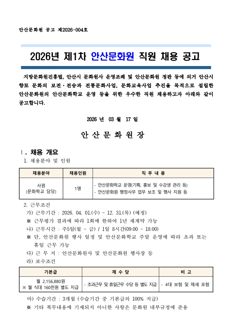 [안산문화원]2026년 제1차 안산문화원 직원 채용 공고