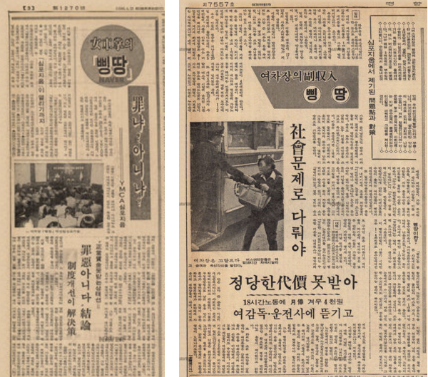 “저는 올해 19세인 서울시내 버스에 종사하는 여차장입니다. 저는 18시간이라는 긴 시간의 노동에 허덕이고 있습니다만 굳세게 살고 있습니다. 그 힘을 저는 일하는 날 얻어지는 3백 원씩의 부수입에 의지하고 있습니다. 그것을 저희들 세계에서 ‘삥땅’이라고 부릅니다. 그러므로 저는 매일 죄의식에 사로잡혀 있습니다만 그 ‘삥땅’이 없으면 살아갈 수도 없습니다. 그러나 저에게는 견딜 수 없는 고민이 있습니다. 매일같이 죄를 저지르면서 도저히 교회에 나갈 수 없기 때문입니다. 저는 영원히 교회와 등져야 합니까? 저는 정말 죄인입니까?” (매일경제신문, 1970년 4월 29일자 3면)